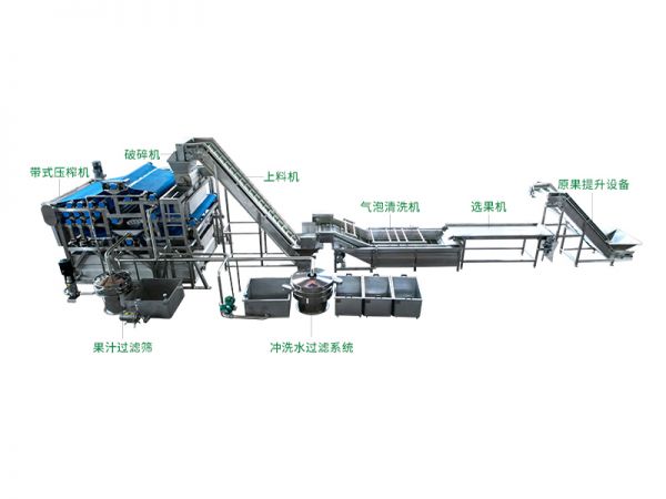 带式果汁压榨生产线主要由原果提升设备、选果机、气泡清洗机、刮板上料机、破碎机、带式压榨机、果汁过滤筛、冲洗水过滤系统等组成。