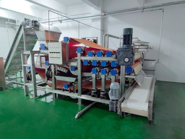 蔬菜汁压榨生产线(如胡萝卜汁、芹菜汁)主要由原果提升设备、选果机、气泡清洗机、刮板上料机、破碎机、带式压榨机、果汁过滤筛、冲洗水过滤系统等组成。它能连续自动完成上料、压榨、滤网洗涤、卸渣等工艺操作,并且原液与滤网洗涤液可以分段收集。具有压榨效率高、生产能力大、洗涤效果好、操作灵活、维护简单等优点。